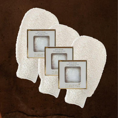 • 3 x Exfoliating Mitts – Gently buff away dry skin and prep for a flawless next tan.